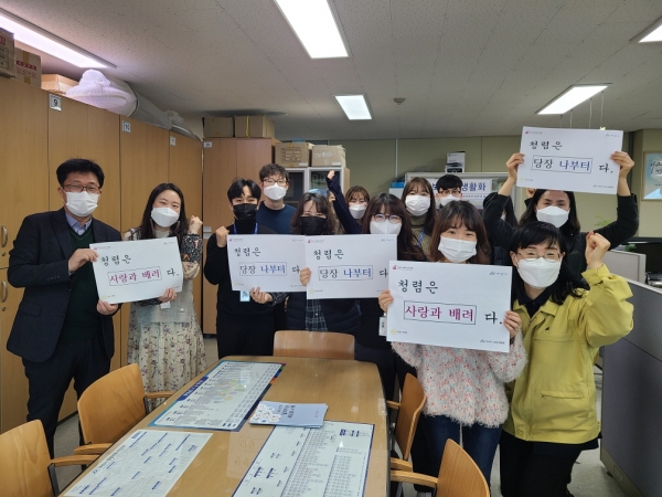 유양순 과장은 “이번 캠페인을 통해 부서원 간 소통하며 다시 한 번 내 안의 청렴의식을 일깨우는 시간을 가질 수 있었다. 앞으로도 이런 캠페인을 자주 실시해 청렴한 조직문화 확산에 앞장서겠다”고 말했다.