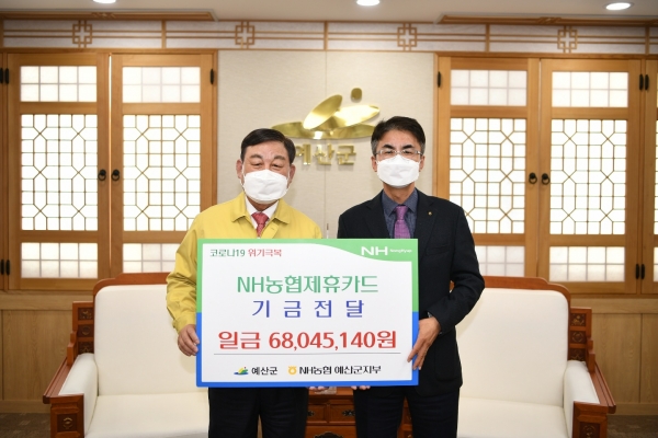 이번에 전달된 기금은 군과 NH농협은행이 제휴한 예산사랑카드, 보조금카드, 공무원복지카드 등 이용금액에 따라 0.1∼0.5%를 적립해 조성한 기금이다.