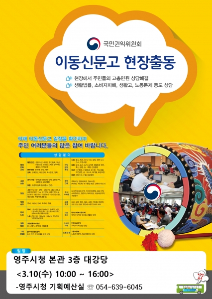 [한국Q뉴스] 경북 영주시는 오는 10일 시청 3층 대강당에서 국민권익위원회 주관으로 ‘이동신문고’를 운영한다.