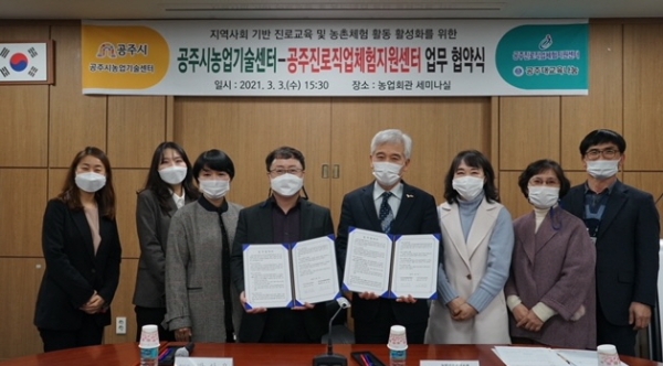 [한국Q뉴스] 공주시농업기술센터는 지난 3일 농업회관에서 공주진로직업체험센터와 지역사회 기반 진로교육 및 농촌체험 활동 활성화를 위한 업무 협약식을 가졌다.