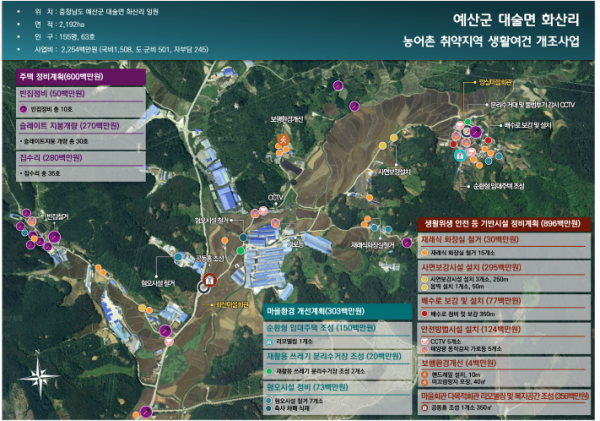 [한국Q뉴스] 예산군은 2021년 농어촌 취약지역생활여건개조사업에 공모를 신청한 삽교읍 하포1리, 대술면 화산리 2개 마을이 모두 최종 선정되는 쾌거를 거뒀다.