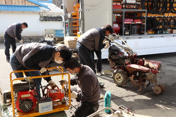 오지마을 위주로 연 1회 찾아가서 경운기, 관리기, 동력분무기, 예취기 등 농가에서 많이 사용하는 농업기계 위주로 수리하고 개당 단가 35,000원 이하의 부품은 무료로 지원한다.