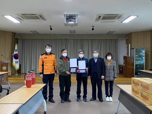 [한국Q뉴스] 군위읍과 군위119안전센터는 지난 5일 군위읍사무소 회의실에서 초동진화로 대형화재를 막은 주민 2명에게 감사장과 소화기 10대를 전달했다.
