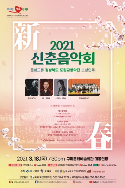 구미시문화예술회관과 공동기획해 개최하는 2021 신춘음악회는 경상북도를 대표하는 공립예술단체인 도립교향악단을 초청해 코로나19 여파로 문화경기 침체 등 힘들었던 시기를 위로하는 희망의 클래식 음악회로 올려진다.