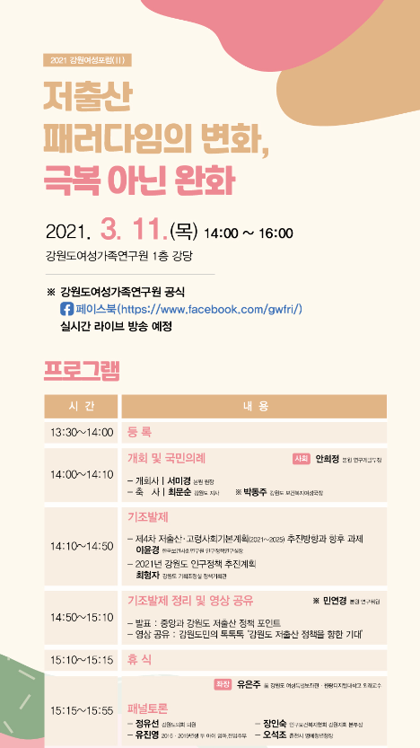 이번 포럼에서는 2020년 12월에 발표된 중앙의 “함께 일하고 함께 돌보는 사회”제4차 저출산 정책 패러다임을 토대로 강원도 저출산 정책의 성과와 향후 과제를 논의한다.