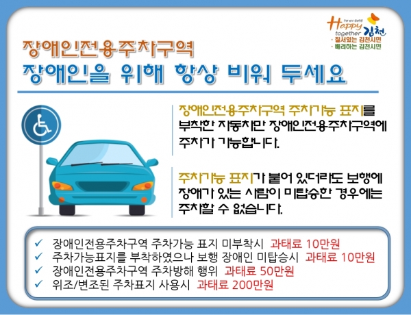사회복지과장은“가구당 보유차량이 증가해 주차구역부족으로 주차에 어려움은 있지만, 장애인을 배려하는 마음으로 장애인전용주차구역은 항상 비워두는 문화가 널리 정착되어 장애인과 비장애인 모두가 행복한 김천이 되길 희망한다”며 시민들의 장애인전용주차구역 준수를 부탁했다.
