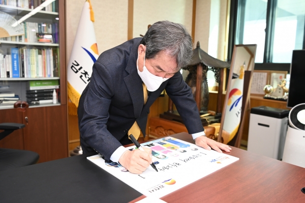 [한국Q뉴스] 김충섭 김천시장이 3월 8일 코로나 19 상황에서도 대면 업무가 불가피한 필수노동자를 응원하기 위해 ‘고맙습니다.