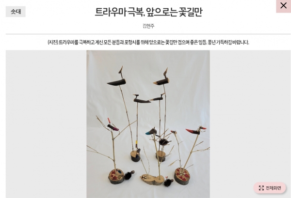이에 많은 시민들이 공모전 작품을 언제든지 감상할 수 있도록 홈페이지 내 온라인 갤러리를 개설했으며 작품 분야는 글, 이미지, 공예로 주제는 지진 트라우마 극복 사연, 지진 트라우마를 호소하는 친구, 가족, 이웃 등 에게 도움을 준 사연, 코로나19·화재 등 기타 트라우마 극복사레 및 응원·격려 등 다양한 주제의 작품이 전시됐다.