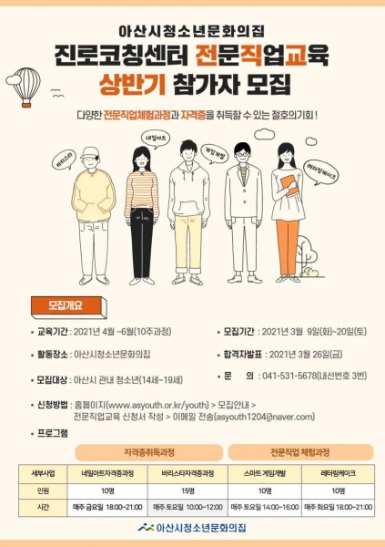 [한국Q뉴스] 아산시청소년문화의집이 3월 9일부터 20일까지 전문직업교육 상반기 과정 참가자를 모집한다.