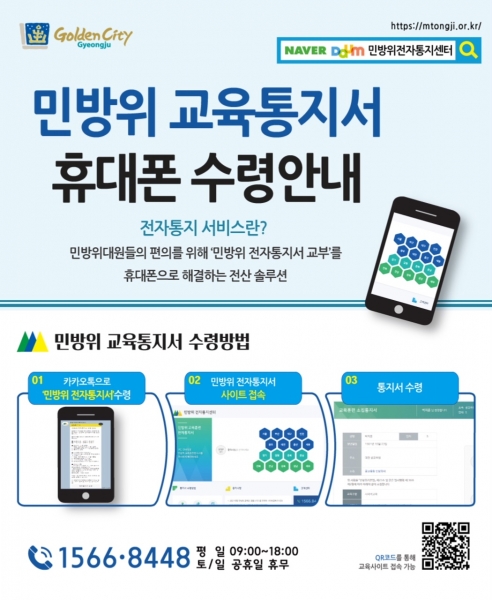 [한국Q뉴스] 경주시가 11일부터 민방위 교육훈련 통지를 대면 방식이 아닌 전자 통지 방식으로 대체한다.