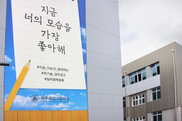 경주공고는 9일 성인문해 교육을 통해 뒤늦게 한글을 배운 칠곡할머니의 글꼴로 제작한 가로5m, 세로10m의 대형 글판을 학교 본관 외벽에 내걸었다.