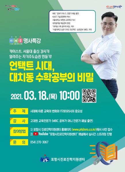 [한국Q뉴스] 포항시는 오는 18일 교육전문가 고대원 명사를 초청해 ‘언택트 시대, 대치동 수학공부의 비밀’ 특강을 개최한다고 밝혔다.