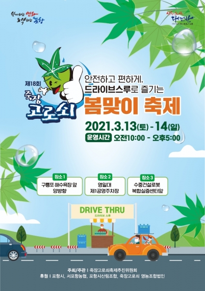 [한국Q뉴스] 포항시는 오는 13일부터 14일까지 구룡포해수욕장 등 주요 관광지 도로변 3개소에서 드라이브스루 방식으로 ‘제18회 죽장고로쇠 봄맞이 축제’를 개최한다.