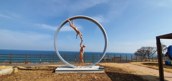 이번에 설치된 작품 중, 첫 번째‘가족사랑’은 나비가 내려 앉아 있는 듯한 형상의 무지개 빛 하트의 선이 파란 바다의 배경과 산뜻하게 어울려 쉼터와 포토존 기능을 하고 작품위에 설치된 오리커플의 모습이 기분 좋은 웃음을 지을 수 있도록 했다.