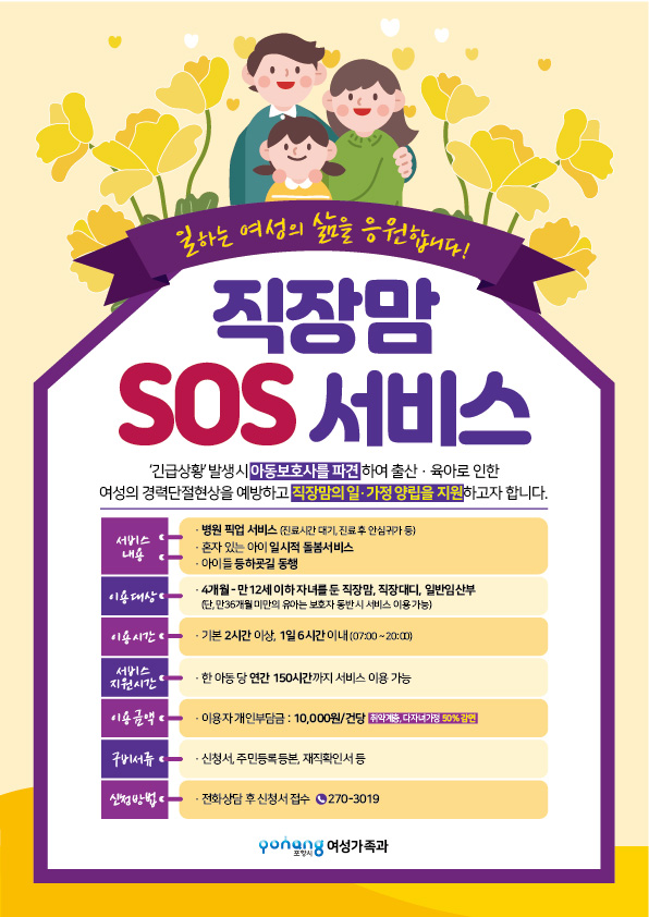 [한국Q뉴스] 포항시는 일하는 여성의 삶을 지원하는 ‘직장맘 SOS 서비스’를 운영을 통해 일·가정 양립 사회 조성에 나선다.