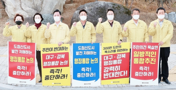 [한국Q뉴스] 예천군의회는 지난 16일 오전 8시 경북도청 서문에서 의원들이 모두 참석한 가운데 대구·경북 행정통합 추진 중단 촉구 집회를 개최했다.