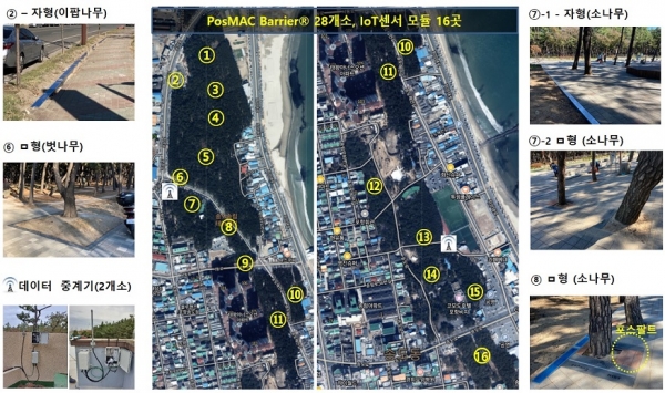 이 테스트 베드는 포스코와 RIST가 공동 개발해 수목의 뿌리 생장 제어 및 안정적인 수분공급 기능을 수행하는 IoT센서 내장형 가로수 보호대를 시범 적용해, 송림숲 전체의 온도 및 토양 수분변화 추이를 모니터링 할 수 있도록 했다.