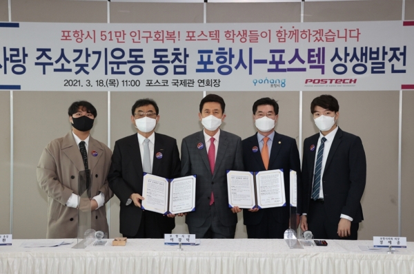 [한국Q뉴스] 포항시는 18일 포스코 국제관에서 포스텍과 포항사랑 주소갖기 운동 동참 상생발전 협약을 체결했다.