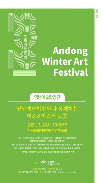 [한국Q뉴스] ‘2021안동윈터아트페스티벌AWAF’의 열여섯 번째 공연 ‘영남예술합창단과 함께하는 미스&미스터 트롯’이 오는 3월 23일 오후 7시30분 안동문화예술의전당 백조홀에서 진행된다.