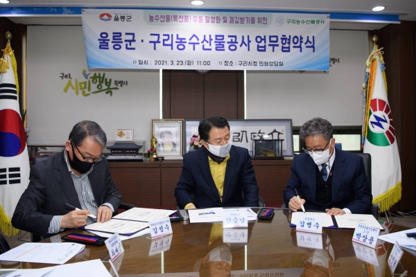 [한국Q뉴스] 울릉군은 3월 23일 울릉군과 구리농수산물공의 협업네트워크 구축 및 특산물 제값받기를 위한 업무협약을 구리시청에서 체결했다고 밝혔다.