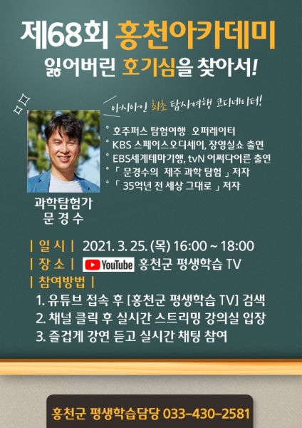 [한국Q뉴스] 홍천군이 오는 3월 25일 오후 4시부터 6시까지 유튜브를 통해 문경수 과학탐험가를 초청한 제68회 홍천아카데미를 운영한다.
