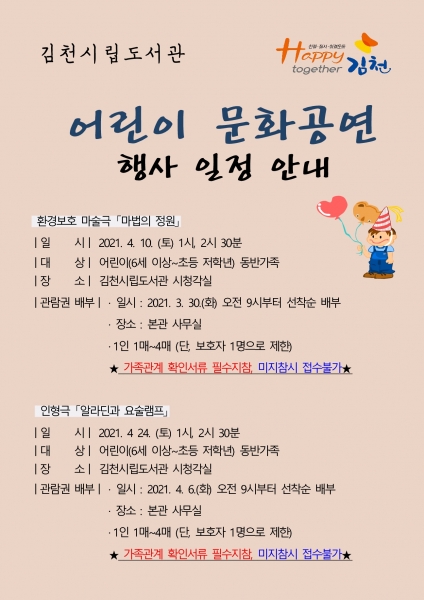 백선주 김천시립도서관장은“따뜻한 봄날 도서관을 방문해 어린이들이 좋아하는 다채로운 문화공연을 보며 코로나로 인한 지친마음을 달래고 가족들과 화합하는 즐거운 시간을 보냈으면 한다”고 말했다.