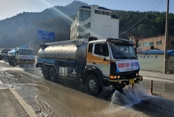 군은 겨울철에 쌓인 도로 제설용 염화칼슘 및 흙먼지로 인한 도로 재비산먼지 저감을 위해 2021년 봄맞이 도로변 물청소를 3월 23일과 24일 양일간 노면청소차 1대, 살수차 3대를 투입해 정선읍 시가지 도로변 물청소를 실시했으며 오는 3월 31일까지 읍·면 시가지에 대한 물청소를 실시할 계획이라고 전했다.