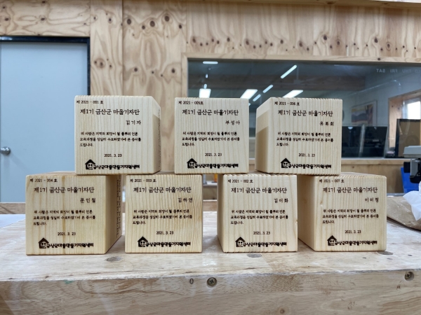 기존 상장 수여 방식에서 벗어난 이번 수료식은 금산군 남이면 소재 청년기업 ‘나무스페이스’와 함께 지역 자원을 활용한 목재 수료패를 직접 만들어 서로 전달하는 방식으로 기획됐다.
