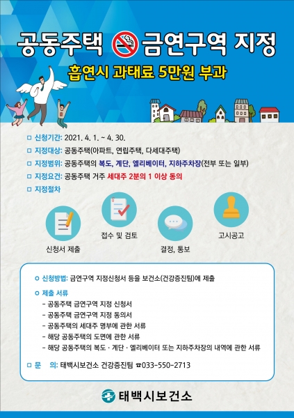 [한국Q뉴스] 태백시보건소는 오는 4월 1일부터 4월 30일까지 간접흡연 피해를 예방하고 담배연기 없는 쾌적하고 건강한 주거환경을 조성하기 위해 ‘공동주택 금연구역’ 지정신청을 받는다.