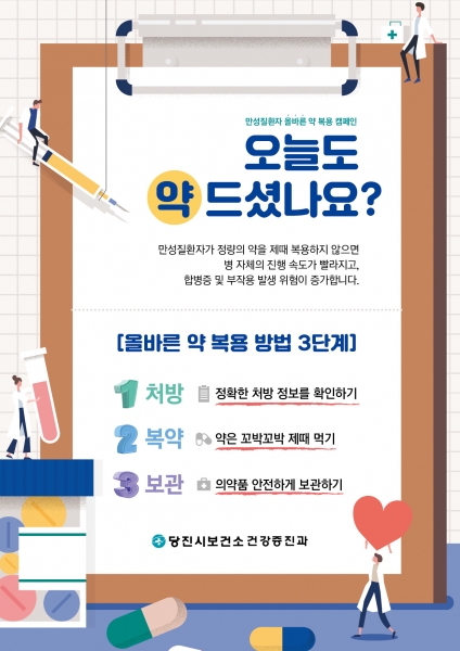 당진시보건소는 처방약을 정확하게 확인하고 제시간에 복용하는 것이 가장 중요하다는 의미로 ‘오늘도 약 드셨나요?’를 캠페인 표어로 정하고 보건기관을 내소하는 만성질환자에게 올바른 약 복용 방법 3단계 홍보와 함께 만성질환 관리 교육도 진행한다.