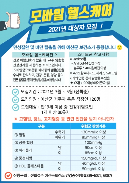 [한국Q뉴스] 예산군보건소는 2021년 모바일 헬스케어 참여자 120명을 선착순 모집한다.