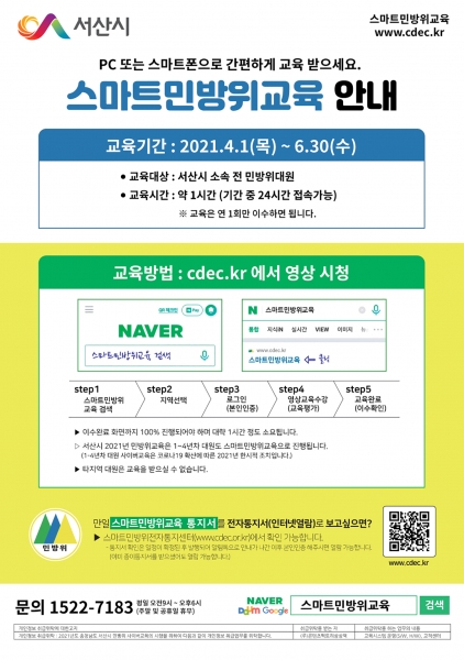 교육은 서산시 홈페이지나 인터넷 ‘스마트민방위 교육’에 접속, 본인인증 후 동영상 교육을 시청하고 객관식 20개 평가문항 중 14개 이상을 맞히면 이수된다.