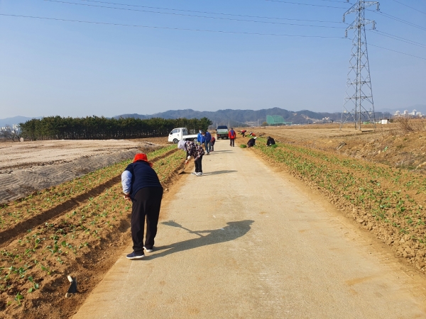 시는 의림지뜰 솔방죽 인근 농로 양쪽에 유채꽃길 500m 구간과 유채꽃밭 854㎡ 등 약3840㎡의 유채경관을 조성하기 위한 첫 작업으로 25~26일 의림지뜰친환경영농조합법인 육묘장에서 겨우내 정성껏 키운 어린 묘 10만 본을 꽃밭에 옮겨 심는 작업을 진행했다.