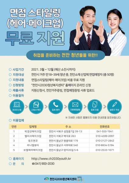 [한국Q뉴스] 천안시2030청년복지센터는 이달부터 취업지원패키지사업의 일환으로 면접 스타일링 헤어·메이크업 서비스를 지원한다고 밝혔다.