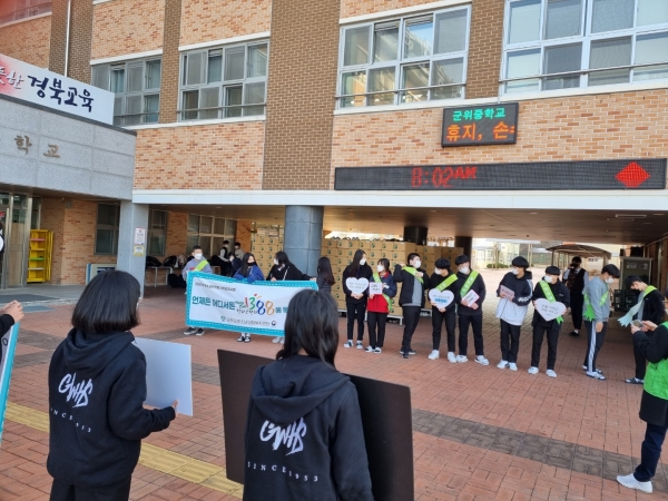 [한국Q뉴스] 군위군 청소년상담복지센터는 지난 23일과 26일 군위중·고등학교와 군위초등학교 정문 앞에서 청소년 전화 1388을 홍보하고 신학기 청소년들을 응원하기 위해 아웃리치 사업의 일환인 아침 등굣길 응원행사와 학교폭력 예방 솔리언 또래상담활동을 진행했다.