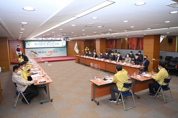 [한국Q뉴스] 김천시는 지난 25일 시청 회의실에서 김충섭 시장을 비롯한 행정, 시의원, 농·축협, 관련 단체장 22여명이 참석한 가운데‘김천시 푸드플랜 수립 연구용역 중간보고회’를 개최했다.