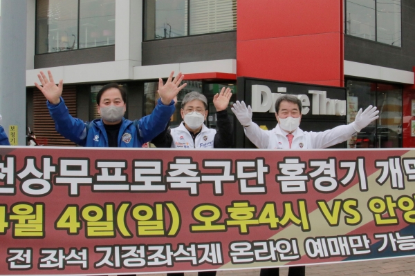 이날 거리 홍보 캠페인에 함께 참여한 김충섭 구단주는 “스포츠 중심도시 김천에서의 홈 개막전을 앞두고 있다 시민들의 김천상무에 대한 기대감이 크다 많은 시민들과 함께 김천상무가 홈에서의 첫 경기를 멋진 승리로 보답 할 수 있기를 바란다”고 말했다.
