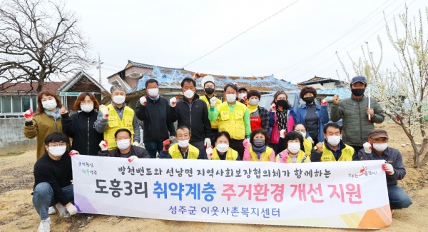 [한국Q뉴스] 성주군 이웃사촌복지센터는 3월 27일 이병환 성주군수, 김경호 성주군의장이 참석한 가운데 선남면 지역사회보장협의체와 함께 도흥3리 취약계층 세대를 방문해 주거환경개선을 위해 구슬땀을 흘렸다.