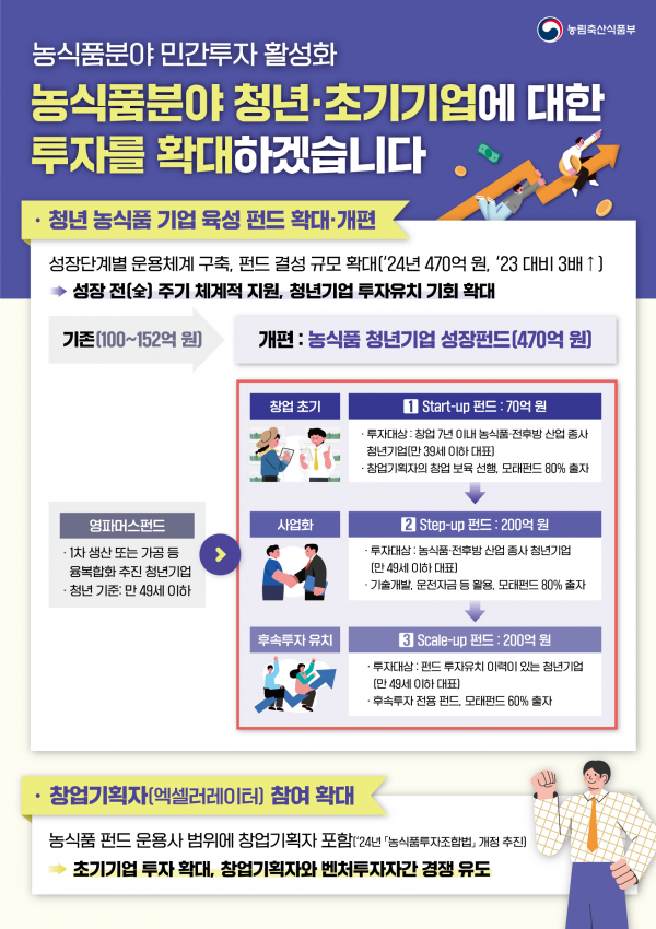 또한 초기기업 발굴·육성에 강점을 지닌 창업기획자가 농식품 펀드 운용사로 참여할 수 있도록 법률 개정을 추진해 농식품 초기기업에 대한 민간투자 확대를 도모할 계획이다.