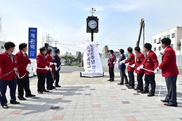 [한국Q뉴스] 국제로타리 3740지구 새제천로타리클럽이 지난 26일 제천역 광장에서 시계탑 조형물 준공식 및 기증식을 가졌다.