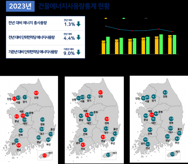 [한국Q뉴스] 국토교통부는 '23년 전국 모든 건물의 에너지사용량을 집계한 결과, 에너지 총사용량과 단위면적당 에너지사용량이 전년 대비 각각 1.3%, 4.4% 감소했으며 기준년 대비 단위면적당 사용량은 9.0% 감소했다고 밝혔다.