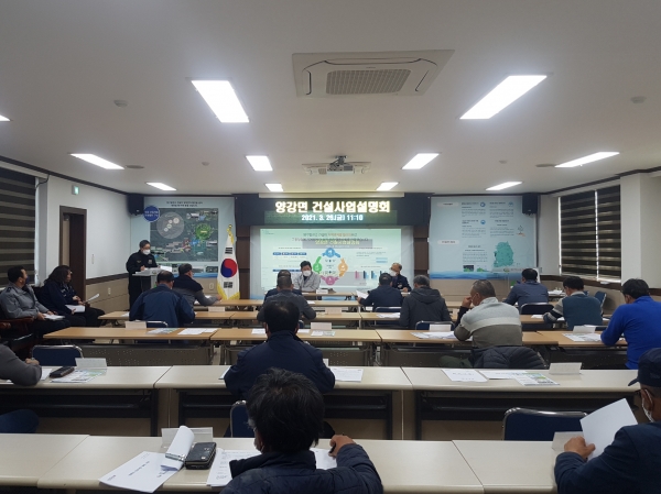 해당 읍면별로 진행 예정인 건설 사업과 영동군에서 시행중인 영동읍 보행환경개선지구 정비사업, 영동천 하천환경 정비사업 등 대규모 건설사업을 설명하며 민원 사전 대처와 건설사업에 따른 농지 편입 예정 지구에 대한 주민의 영농결정 애로사항 해결에 초점을 맞췄다.