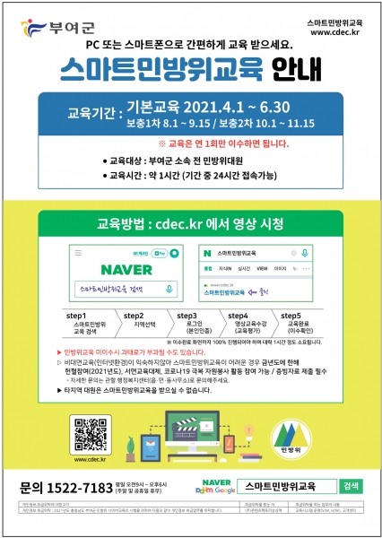 [한국Q뉴스] 부여군이 코로나19 확산 방지를 위해 올해 민방위 교육을 비대면 사이버 교육으로 전면 실시한다고 밝혔다.