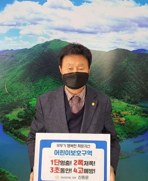 백석현 괴산경찰서장의 지목을 받은 신동운 의장은 ‘어린이 교통안전, 1단 멈춤, 2쪽 저쪽, 3초 동안, 4고 예방’이라는 문구의 피켓을 든 사진을 자신의 SNS에 올렸다.