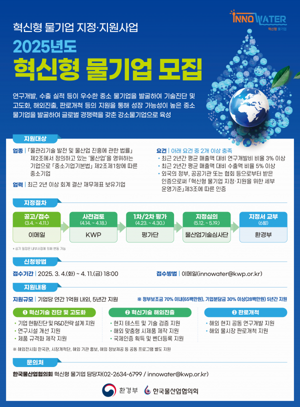 환경부는 2020년부터 매년 연구개발·수출 실적 등이 우수한 중소 물기업 10곳을 ‘혁신형 물기업’ 으로 지정하고 지정기업에 대해 5년간 연구개발 및 사업화, 해외 진출 등을 위해 최대 약 5억원을 지원하고 있다.