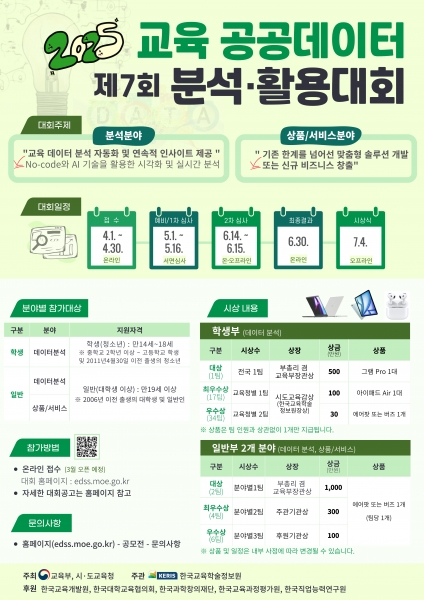 대회 참가 신청은 교육 공공데이터 분석활용대회 누리집에서 다음 달 1일부터 가능하며 최종 시상식은 오는 7월 4일 개최될 예정이다.