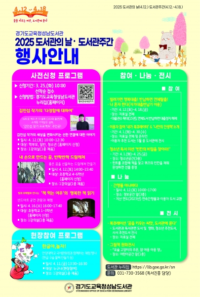 [한국Q뉴스] 경기도교육청성남도서관이 2025 도서관의 날과 도서관 주간을 맞이해 다음 달 12일부터 다양한 독서문화 행사를 개최한다.
