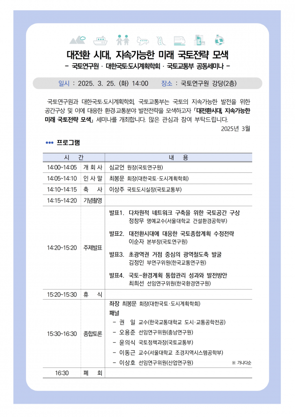 세미나에서는 다층적 국토공간 형성 등 새로운 국토공간 재편 구상과 초광역 메가시티 조성을 위한 광역철도축, 국토-환경계획 통합관리 방안 등에 대한 연구기관별 발표를 시작으로 전문가 토론이 진행된다.