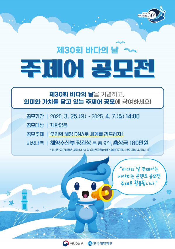 [한국Q뉴스] 해양수산부와 한국해양재단은 제30회 바다의 날을 기념해 3월 25일부터 5월 8일까지 ‘대국민 릴레이 콘텐츠 공모전’을 개최한다고 밝혔다.