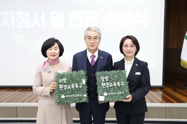 [한국Q뉴스] 경상남도교육청은 도내 18개 전 교육지원청을 ‘2025년 환경교육 특구’로 지정하고 25일 본청 대강당에서 지정서와 현판을 수여했다.